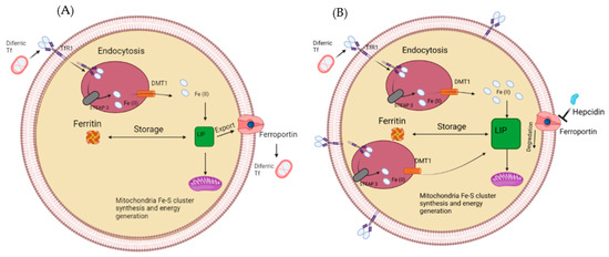The labile iron pool is in a dynamic equilibrium, shifting and changing its constituents depending on the availability of iron, resulting from the influx and efflux of iron from the cell or the stored forms of iron. The iron within this labile iron pool can either be Fe2+ or Fe3+ but is generally accepted to contain more Fe2+ due to the great quantity of water and reductants in cells [47]. Iron within the labile iron pool is bound to intracellular proteins to minimise potentially toxic Fenton chemistry. One of the main intracellular proteins is iron(II)glutathione conjugates [47,48]. The labile iron pool is generally regulated by storing excess iron in a complex with ferritin or exporting it outside the cell with FPN-1. One of the main ways of protecting normal cells from excess labile iron and Fenton chemistry is storing iron in ferritin. For exporting, Fe2+ iron is converted back to Fe3+ by ferroxidase [49]. The molecules Ft and FPN-1 have an iron response element: hairpin loop structures in the 5′ direction on their untranslated region (UTR) of mRNA [50]. These interact with mRNA binding molecules called iron-regulating protein one and iron-regulating protein two (IRP1 and IRP2). When iron conditions are low, IRP1 binds to an iron-responsive element (IRE) in the 5′UTR on the mRNAs of Ft or FPN-1, which blocks, through steric hindrance, the recruitment of ribosomes and obstructs translation [51]. IRP1 binds to the 3′ UTR on TfR1, and DMT1 masks the mRNA to endonuclease digestion, stabilising it. The consequence of the IRP1s actions on iron is to reduce export and increase import, increasing iron levels in the cell. This occurs as IRP1 is an enzyme known as cytosolic aconitase and contains a full [4Fe-4S] cluster in the presence of high iron conditions. However, when intracellular iron levels are low, there is not enough iron for Fe-S biogenesis resulting in a [3Fe-4S] cluster on the enzyme [52]. Therefore, aconitase cannot function enzymatically, resulting in its IRP1 activation. IRP1 therefore utilises a unique iron-sulphur cluster switch to sense iron levels. Simultaneously, low iron conditions result in the ubiquitination of IRP2, resulting in more iron efflux [50]. Through these mechanisms, in normal conditions, the labile iron pool size results from increases or decreases in iron influx and efflux, which are regulated in correspondence to the cells’ needs.