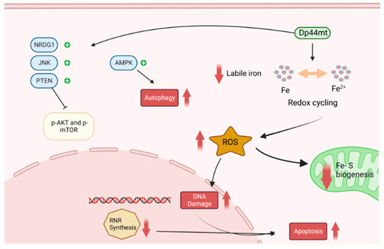 The potential therapeutic effect of redox-active iron chelators in cancer increasing ROS resulting in DNA damage while reducing the size of the labile iron pool in theory and thus iron available for Fe-S biogenesis and RnR (ribonucleotide reductase) synthesis. The iron chelator Dp44mt for example also upregulates NRDG1 and other cell signalling pathways.