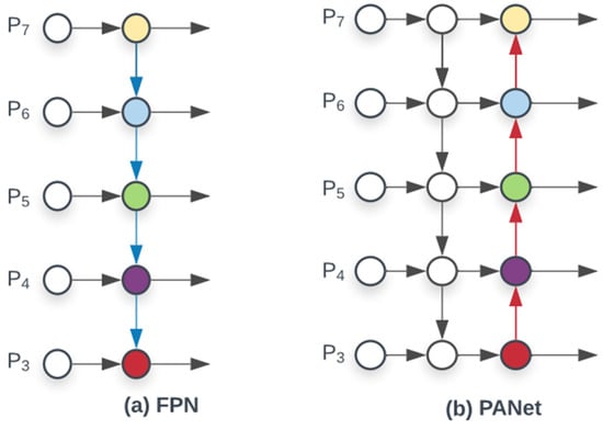 Feature pyramid network (FPN) (a) introduces a top-down pathway to fuse multi-scale features from level 3 to 7 (P3–P7); (b) PANet adds an additional bottom-up pathway on top of FPN [45].
