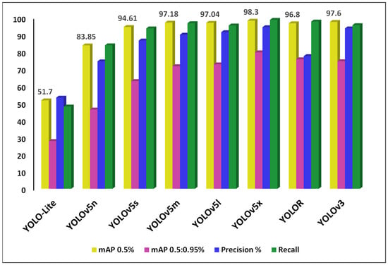 In object detection, a false negative (FN) denotes that the models should have predicted a positive result but detected it incorrectly. Using the output from IoU, the indicators precision, recall, F1 score, and mAP compute object recognition models performance. For object recognition models, precision, recall, and mAP is popular technical indicators to evaluate overall performance. Precision, recall, and mAP are defined in Equations (1) to (4) respectively. With the obtained values TP, TN, FP, and FN. For mAP@IoU = 0.5, the threshold was set 0.5, and for mAP: IOU = 0.5:0.95, the threshold has taken 10 different values between 0.5 and 0.95 in steps of 0.05.