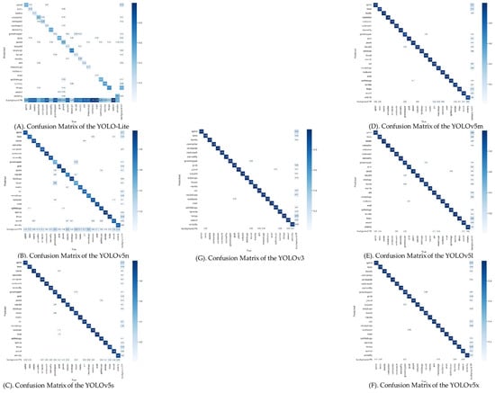 Confusion Matrix of (A) YOLO-Lite (B) YOLOv5n (C) YOLOv5s (D) YOLOv5m (E) YOLOv5l (F) YOLOv5x (G) YOLOv3.