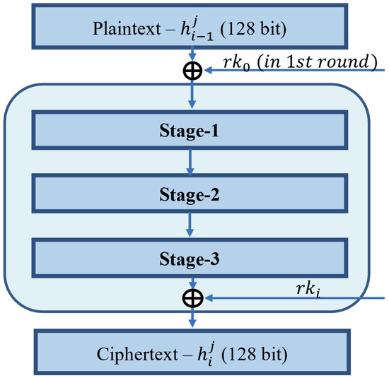More details about the HBC-256 hashing algorithm described in [15]. The general scheme of message hashing at k = 3 is shown in Figure 1, where k is the number of parts, is a message block M consisting of 128 × k bits, . The proposed algorithm HBC-256 takes from the message M as a master key , and the encrypted text–the previous intermediate hash value , . At the very beginning of the process of hashing the message the initial hash value is taken as , i.e., null value. Based on message blocks , round keys , , are generated, where is the number of rounds for hashing message block .