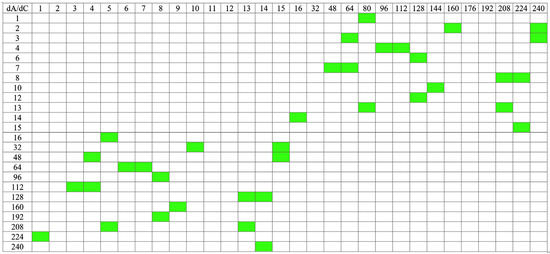 Boxes S01...S33 were formed in the same way. All boxes were analyzed for differential properties. It was shown that for each box there is a range of differences transforming with a probability of 1/4. This was expected from the results of the analysis of boxes S0...S3 (Table 4 and Table 5). This situation occurs when one S-box receives a difference 0000 at its input (which is converted into an output difference 0000 with probability 1), while the second S-box has input a difference with a probability of occurrence ¼. However, such precalculations significantly reduce the time to analyze the hash function structure and allow a better understanding of byte’s difference changes. An example of a fragment of the table with the results of the analysis for box S00 is shown in Figure 3. The vertical line represents some input differences and the horizontal line the output differences. At the intersection, the cells for which the probability of forming the corresponding output difference for a certain input difference is ¼ are colored.