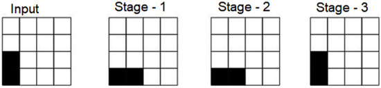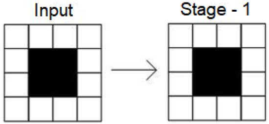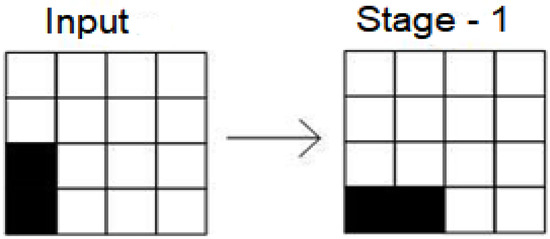 The idea for finding the right pairs of texts was to find such differences in texts that, having gone through the transformation, would involve the least number of array elements. The work began with the search for a suitable matrix fill. Many different combinations were tried. An example of one of the options is shown in Figure 4. In Figure 4 and further, white cells mean zero difference in the state, while black cells mean nonzero value of the difference. Further analysis revealed an even more appropriate variant of difference transformation (Figure 5).