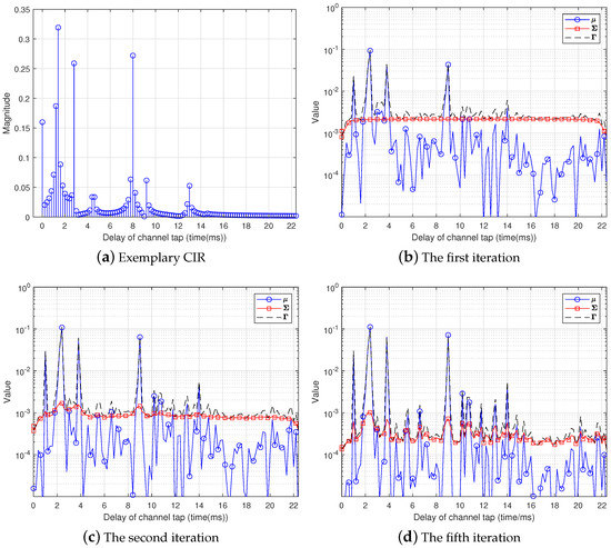 In the EM algorithm, at the E step, the posterior covariance matrix is computed with , and the posterior mean is computed with the . Then, is updated based on and at the M step. These updates are performed alternatively at every iteration until convergence. Upon convergence, many of the diagonal components of , converge to zero and so do the corresponding , resulting in sparse estimates of the CIR vector [17]. To investigate the convergence behavior of the SBL-based CE, , diagonal elements of , and at the first, second, and fifth iterations are represented in Figure 1b–d, respectively, for a given time-invariant CIR depicted in Figure 1a. It can be observed that the diagonal elements of decrease while converges to as the iteration progresses. It is also noted that and become more sparse, in which distinct components become more dominant while insignificant components diminish substantially.
