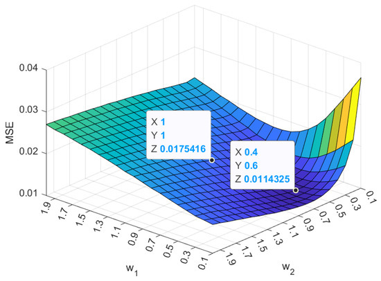 The MSE performance of the proposed method according to different values of weights and is shown for SNR = 12 dB in Figure 2, where the number of iterations is set to 5. It can be observed from the figure that weights smaller than improved the performance compared with the case of , which is equivalent to the conventional SBL method in (20). The optimal weights are yielded as and . Note that the optimal weights agreed with conditions 1 and 2 derived in the previous subsection. Specifically, both optimal weights smaller than supported condition 1, while justified condition 2.