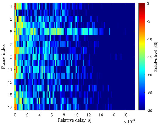 The proposed F-SBL method was applied to experimental UWA OFDM signals to further verify the performance in real underwater conditions. The signals were acquired in an at-sea experiment performed in the Western Sea of Korea from 19 to 20 August 2018. The UWA OFDM system with the parameters in Table 1 was used. A total of 17 frames were transmitted throughout the experimental period. Each frame was composed of 54 OFDM symbols that carried OPSK modulated symbols encoded via a turbo-code (with a code rate of 1/3). The communication range was between 2500 and 3500 m, and the measured sea depth was about 30 m. The underwater CIR estimate corresponding to each frame is shown in Figure 6. We can clearly see that the channel had time-varying characteristics and multi-paths with long delays.