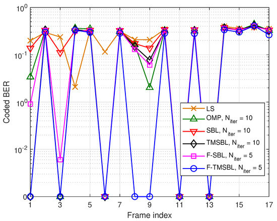 Figure 7 shows the coded BER performance according to the frame index. It can be observed from the experimental results that the proposed F-SBL and F-TMSBL outperformed the conventional schemes. F-TMSBL yielded the largest error-free reception number, achieving the best BLER. F-SBL exhibited lower-coded BER than the conventional SBL method even with fewer iterations. The experimental results confirm the effectiveness of the proposed method for real underwater channels.