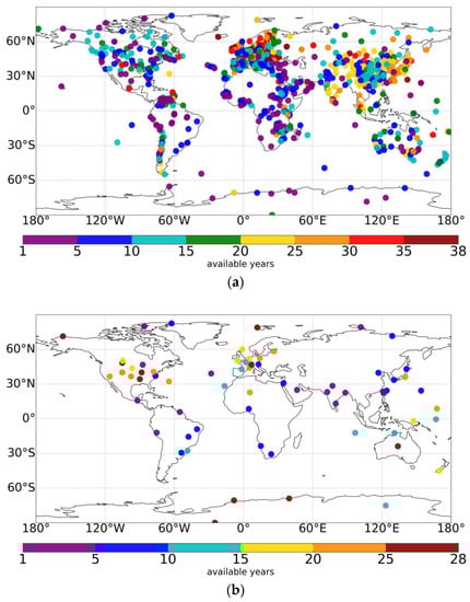 Global Distribution of: (a) Global Energy Balance Archive (GEBA) 1099 stations and (b) Baseline Surface Radiation Network (BSRN) 70 stations, whose surface solar radiation (SSR) data (availability in years indicated in the colorbar) have been used in this study.