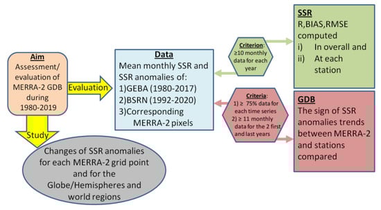 The evaluation of MERRA-2 GDB is examined through comparisons against GEBA and BSRN measurements using monthly mean SSR fluxes and deseasonalized anomalies, which were computed by subtracting from each monthly SSR value the corresponding long-term (different for each station) averaged value. SSR anomalies were preferred to corresponding absolute fluxes in the computation of either the correlation coefficients or the trends of time series, since the use of deseasonalized anomalies minimizes the seasonal component of variability, which is assumed to be periodic with constant amplitudes and thus does not have much impact on the long-term variability [90]. On the other hand, the computation of other evaluation statistical metrics, such as the absolute and relative percent bias and root mean squared error (RMSE), were done using the absolute monthly SSR fluxes. Specific data availability criteria have been applied in the analysis in order to ensure the maximum possible robustness of the obtained results and conclusions. Thus, in the comparison between MERRA-2 and GEBA/BSRN SSR fluxes and anomalies, each year was required to have more than 10 months of measurements available, in order to exclude years with poor seasonal representativeness, which would degrade the comparison quality. The application of this criterion resulted in availability of 1099 GEBA and 70 BSRN stations (out of the originally available 1397 GEBA and 73 BSRN stations). These stations, shown in Figure 1, still ensure a satisfactory geographical coverage of the world’s continental areas, of course more for GEBA than BSRN. The different steps of the applied methodology are outlined in Figure 2.