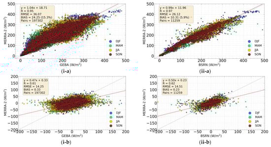 Scatterplot comparison between MERRA-2 Reanalysis and GEBA (i-a), and BSRN (ii-a) SSR fluxes and between MERRA-2 and GEBA (i-b) and BSRN (ii-b) deseasonalized SSR anomalies. The linear regression fit, and the associated statistical metrics, namely the equation of the applied linear fitting, the correlation coefficient (R), the root-mean squared error (RMSE), the bias and the total number of matched data pairs, are also shown. The comparison is shown separately for each season (December–February, March–May, June–August and September–November) in different colors (the respective main statistical parameters are given in Table 1).