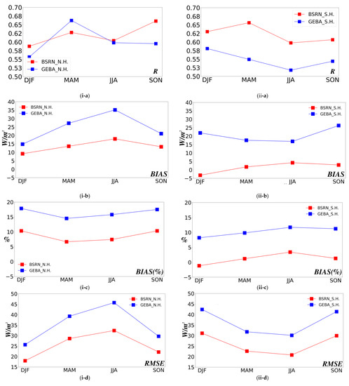 Seasonal variation of hemispherical averages of correlation coefficient R (i,ii-a), bias in W/m2 (i,ii-b), percent relative bias in % (i,ii-c), root mean squared error (RMSE in W/m2) (i,ii-d) and percent relative RMSE in % (i,ii-e) between MERRA-2 and GEBA (blue) and BSRN (red) stations, computed using SSR fluxes (except for R that is computed using deseasonalized SSR anomalies) for the North Hemisphere ((i)-left column) and South Hemisphere ((ii)-right column).