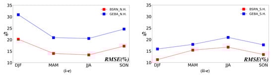 Apart from assessing the performance of MERRA-2 SSR on an annual basis, this has also been done on a seasonal basis, since this may help to identify possible source of errors. It should be noted that, due to the substantial seasonal variation of SSR fluxes, not only the absolute, but also the relative biases were computed. According to Table 1, R and relative percent bias do not show significant seasonal changes, apart from slightly (by up to 0.1) lower R values in boreal spring and summer, especially for GEBA, and better in winter and autumn. This is not valid for R computed with deseasonalized SSR anomalies, which is best in spring (and autumn for BSRN). On the other hand, BIAS and RMSE have a remarkable seasonal range, up to about 18/8.5 W/m2 for bias and GEBA/BSRN, respectively, and up to about 17/8 W/m2 for RMSE and GEBA/BSRN, respectively, being largest in summer due to the largest absolute amounts of SSR. Similar findings for RMSE and bias were found by [38], who used GEBA and CMA station SSR measurements, and by [39], who used GEBA and BSRN station measurements, but for shorter time periods. Besides, the relative RMSE doesn’t exhibit significant seasonal changes (they are less than 7/1.9 W/m2 for GEBA/BSRN respectively). The obtained metrics are generally better for the comparison with BSRN than GEBA station measurements, which is encouraging, given the higher quality of this network [88]. In order to more effectively assess the seasonal performance of MERRA-2 SSR, and given the systematic 6-month shift of extreme seasons between the two hemispheres, the seasonal variation of main statistical metrics, namely R, RMSE (in absolute and % terms) and bias (in absolute and % terms) were also computed separately for the two hemispheres and they are given in Figure 4. The results of this figure were obtained using SSR fluxes except for R, which is computed using deseasonalized SSR anomalies (the corresponding R using absolute SSR fluxes is given in Figure S3). As shown in Figure 4, there are high bias and RMSE values in summer in both hemispheres. Nevertheless, it must be taken into account that these values correspond to the highest summer values of SSR. In contrast, the highest relative bias (17.9%) and RRMSE (30.9%) values are in winter in both hemispheres (Figure 4c,e). Similarly, the R values computed using deseasonalized SSR anomalies are lowest in winter (0.52). These results indicate that the MERRA-2 SSR perform worst in the cold period of the year. The different performance of the reanalysis SSR products with seasons may be due to the seasonally varying deficiencies in the reanalysis cloud coverage, aerosol optical depth or water vapor [39,47].