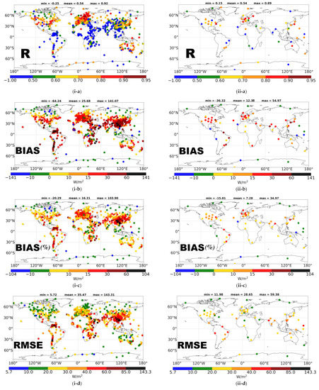 Global distribution of correlation coefficient (i,ii-a), bias (i,ii-b) and relative percent bias (i,ii-c) root mean squared error (i,ii-d), relative root mean squared error (i,ii-e), computed for the comparison between MERRA-2 and each GEBA ((i), left column) and BSRN ((ii), right column) station SSR fluxes, except for R that is computed using deseasonalized SSR anomalies.