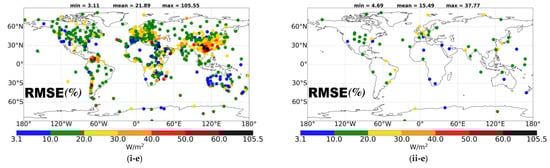 Large RMSE values are computed over tropical and sub-tropical regions, confirming the difficulties of MERRA-2 to appropriately reproduce SSR there. The average RMSE for all GEBA stations is 35.47 W/m2, with values ranging from 5.72 to 143.31 W/m2 and with 75% of GEBA stations having RMSE less than 40.3 W/m2. Respectively, the average RMSE for all BSRN stations is 28.65 W/m2, still lower than the corresponding value for GEBA, ranging from 11.98 to 59.38 W/m2 and with 75% of BSRN stations having RMSE less than 31.9 W/m2 (Figure S5). Similar geographical patterns appear for the relative RMSE, for which 75% of GEBA/BSRN stations have values smaller than 26.1%/20.3% and with high values found especially over Southern China, North Europe and some tropical and subtropical regions.