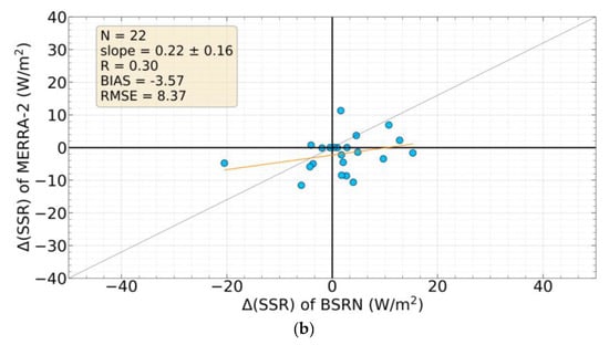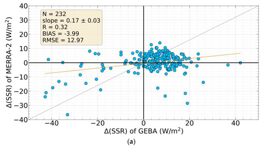 Scatterplot comparison between MERRA-2 and GEBA (a), and MERRA-2 and BSRN (b) Δ(SSR) or GDB (in W/m2). The linear regression fit, and the associated statistical metrics, namely the slope, the slope error, the correlation coefficient (R), the root-mean squared error (RMSE), the bias (MERRA-2 minus stations) and the total number of matched data pairs, are also shown.