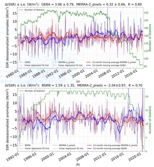 Time series of averaged SSR anomalies for GEBA stations ((a), blue curve) and BSRN stations ((b), blue curve) along with those for the corresponding MERRA-2 pixels (red curves). The number of available stations for each month is also shown in green color. 12-month moving averages for each time series are also shown in same colors. The computed Δ(SSR) and the associated standard deviation along with the correlation coefficient (R) between the two sets of time series (1980–2017 for GEBA and 1992–2020 for BSRN) are given at the top of figure.