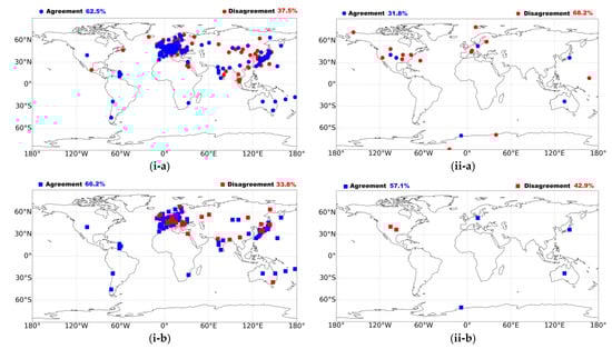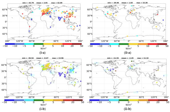 Agreement (blue dots) and disagreement (red dots) between trends of MERRA-2 and station deseasonalized SSR anomalies (Δ(SSR)), for GEBA (i-a) and BSRN (ii-a) stations for the period 07/2000–06/2017. The stations showing agreement at the surface against GEBA stations (i-a) and BSRN stations (ii-a), also having agreement of Δ(OSR) with CERES at TOA, during the same period, are shown in (i-b) and (ii-b), respectively.
