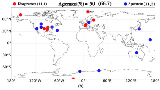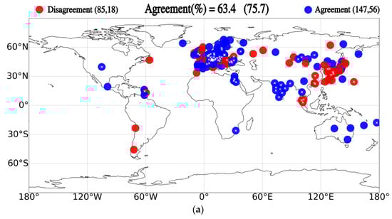 Agreement (blue dots) and disagreement (red dots) between trends of MERRA-2 and station deseasonalized SSR anomalies for GEBA (a) and BSRN (b) stations. The embedded white “x” symbols indicate the statistically significant trends for both MERRA-2 and stations. At the top left and top right parts above each panel figure, the numbers in parentheses provide the total number of stations for which there is agreement/disagreement (first number in parentheses) and the corresponding numbers for statistically significant trends (second number in parentheses). At the top center of each panel figure, the percent numbers of stations for which agreement, as well as those for which statistically significant agreement (in parenthesis), is found, are given.