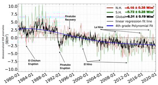 Figure 12 displays the time series of the computed average deseasonalized SSR anomalies for the Globe, Northern Hemisphere and Southern Hemisphere over the 40-year period January 1980–December 2019. The MERRA-2 hemispherical SSR anomalies range from −8 to 10.52 W/m2, while the global mean SSR anomalies vary up to 6.33 Wm−2. Large positive anomalies (brightening) are found during 1980–1991, while systematic negative anomalies, i.e., dimming, are observed during 2003–2019. This leads to an overall strong negative trend over the entire 1980–2019 period either over the Globe and the two hemispheres. Stronger positive anomalies occur in the SH than in the NH during 1980–1991, while after the Pinatubo eruption (1991) and through to 2019 larger negative anomalies occur again in the SH than in the NH. The 4th-order polynomial fit applied to the 40-year time-series shows a stronger decline of SSR during the period 1991–2008, against a stabilizing tendency of SSR afterwards. The decreasing SSR of MERRA-2 during 1991–2000 is not in agreement with most measurements and modelling studies [10,20,21,23], while during 2000–2009 this negative trend is in line with other studies [12,34,36]. MERRA-2 reproduces strong decreases of SSR, namely solar dimming, caused by the great volcano eruptions of El-Chichon (1982) and Pinatubo (1991), as well as by strong El-Nino’s (e.g., 1998, 2004 and 2012). Years characterized by the El-Chichon and Pinatubo recovery, as well as La-Nina’s (e.g., 2008, 2015 or 2018), are characterized by positive anomalies corresponding to brightening. These findings prove that MERRA-2 Reanalysis appropriately reproduces physical phenomena, such as volcanic eruptions and ENSO (El Nino Southern Oscillation), which drive the Earth’s climate.