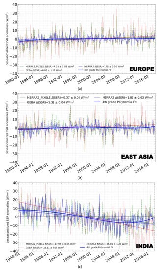 Timeseries (January 1980–December 2017) of deseasonalized anomalies of SSR for three selected world areas with homogeneous trends (see red rectangles in Figure 11), namely, Europe (a), East Asia (b) and India (c). For every area, results are given based on GEBA stations (red dotted lines), corresponding MERRA-2 pixels (including the stations, green dot-dashed lines) and all MERRA-2 pixels of the areas (blue lines). Moreover, the linearly fitted lines to each timeseries are also displayed with similar colors, while blue line displaying the 4th-order polynomial fit applied to the time series of MERRA-2 SSR for the entire world areas are also shown.