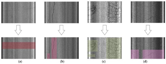 Image annotation visualization. (a) Transverse cracks; (b) longitudinal cracks; (c) alligator crack; (d) crack sealing.