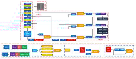 The network structure of YOLOv4 mainly consists of four parts: Input, Backbone, Neck, and Head, where the Backbone module is the initial feature extraction of the input image, the Neck module is to enhance the extracted image features, and the Head module uses the extracted features for detection, as shown in Figure 2. The Input module compresses random input images to the size of 416 × 416 and delivers them to the Backbone module. The CSPDarknet53 of the Backbone module is composed of the DarknetConv2D_Batch normalization_Mish (CBM) module and the CSP (cross-stage partial network) module; the Backbone module outputs three initial feature layers with feature map height, width, and the number of channels of 52 × 52 × 256, 26 × 26 × 512, and 13 × 13 × 1024, respectively. The Backbone module and the Head module are inserted between the depth feature extraction module, which is called Neck. The Neck module includes the spatial pyramid pooling (SPP) [44] and the path aggregation network (PANet) [45]. Among them, the SPP can fuse features of multiple dimensions together, and its structure uses pooling kernels at different scales of 1 × 1, 5 × 5, 9 × 9, and 13 × 13 to maximize the pooling of the feature layer result output from the backbone convolution, which can effectively increase the acceptance domain range of the backbone features and separate the most significant upper and lower background features. The PANet structure proposed in 2018 is an innovation in the field of the International Conference on Computer Vision and Pattern Recognition (CVPR) image segmentation, having the advantage of accurately preserving spatial information and helping to correctly locate pixel points, and its main role is to perform feature fusion on the three initial effective feature layers so that better and more effective feature layers can be extracted to improve the detection accuracy of the detection module Head. In the Head module, the decoding operation is performed on the obtained feature maps, and YOLO Head presets three anchor boxes to predict the target boxes. The input images are scored and boxed on each of these three scales during detection, and the target to be detected is finally selected.