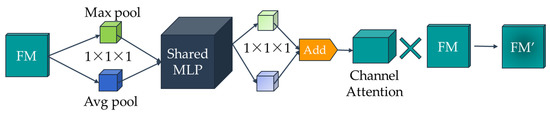 The process of feature map enhanced by attention channels can be displayed in Figure 3. The input feature map F is assumed to be H × W × C, where H, W, and C are the length, width, and number of channels of the feature, respectively. The input feature map is firstly subjected to a pooling layer of 1 × 1 × c (c is the number of channels) and a global average pooling layer of 1 × 1 × c, and then performs the shared MLP (muti-layer perception) operation. Subsequently, feature extraction is performed once again to obtain the maximum pooling channel and the global average pooling channel. The two are superimposed in a one-dimensional vector summation to obtain the attention channel. Finally, the attention channel is multiplied with the initial input feature map to obtain the feature map FM’ enhanced by the attention channel.