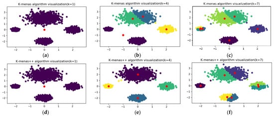 Comparison between K-means and K-means++ algorithms. (a) One cluster centers (K-means). (b) Four cluster centers (K-means). (c) Seven cluster centers (K-means). (d) One cluster centers (K-means++). (e) Four cluster centers (K-means++). (f) Seven cluster centers (K-means++).