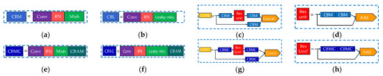 The original module and the improved module. (a) CBM module. (b) CBL module. (c) CSP module. (d) Resunit module. (e) CBMC module. (f) CBML module. (g) CSPX’ module. (h) Resunit’ module.