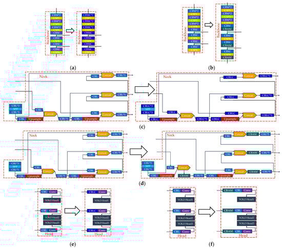 Subsequently, the modules were replaced separately for each region of the new module, and a total of three new models were obtained, as shown in Figure 7, namely/YOLOv4B1 (for the Backbone, Figure 7a), YOLOv4N1 (for the Neck, Figure 7c), and YOLOv4H1 (for the Head, Figure 7e). After that, YOLOv4B2 was obtained by adding CBAM modules to the three feature layers in the Backbone region that were to be input to the Neck region (Figure 7b). YOLOv4N2 was obtained by placing the CBAM module after each of the Concat layers in the Neck region (Figure 7d). Moreover, YOLOv4H2 was obtained by placing the CBAM module after the three feature layers in the Head region that would be accepted from the Neck region (Figure 7f).