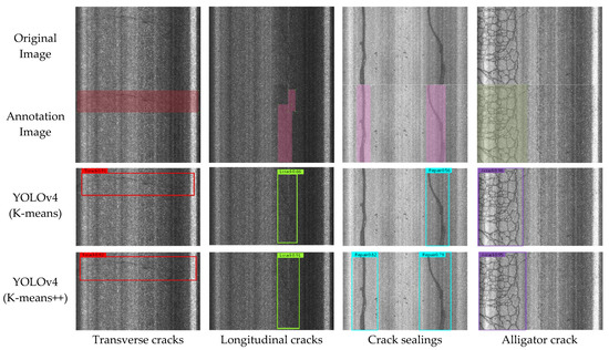 Four types of crack images were randomly selected, and their comparison results are shown in Figure 9. YOLOv4 (K-means) and YOLOv4 (K-means++) had similar APs for transverse cracks and alligator cracks; however, the latter had 25 percentage points higher AP for longitudinal cracks and 23 percentage points higher AP for right-hand crack sealing and detects crack sealing that are not detected by the former. It indicates that the Anchor box calculated by K-means++ has more stability of detection than K-means and is more suitable for detecting pavement damage. It can be seen that F1-Score enhancement allowed the model to detect longitudinal cracks and crack sealing with better accuracy.