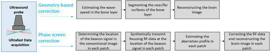 The block diagram showing the processing procedure for the geometry-based and phase-screen aberration correction techniques when an ultrafast imaging sequence (multi-angle plane wave) is used for data acquisition.