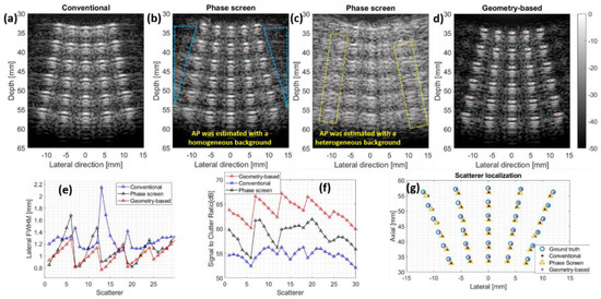 The reconstructed numerical images using (a) conventional beamforming, (b,c) phase-screen modeling, and (d) geometry-based reconstruction techniques with a flat bone model (Figure 3a). The aberration profile (AP) was estimated using the dataset generated with a (b) homogeneous and (c) heterogeneous background wave-speed model. The red dots indicate the true location of the scatterers. The blue triangles in (b) indicate the region that was used as background for quantifying the signal-to-clutter ratio calculation in Table 1. The yellow boxes in (c) indicate the regions at which the scatterers are completely missed. The lateral FWHM (e) and signal-to-clutter ratio (f) and localization error (g) obtained with all the methods for each scatterer.