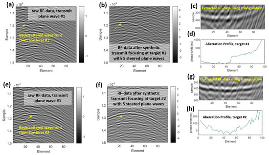 Figure 5c shows the reconstructed image by the PS method when the AP used for phase aberration correction by the PS method is estimated with a heterogeneous background wave-speed model. Many scatterers (see the yellow boxes) are undetectable due to the low accuracy of the aberration profile estimation. As shown in Figure 6f, the focused RF data of the second scatterer (acting as the beacon signal for patch two; see Figure 3c) are better distinguished from the background speckle noise (caused by variation in the background wave-speed speed) compared to the focused RF data of the first scatterer (see Figure 6b). This helps with better estimating the aberration profile and results in better reconstruction of the scatterers in patch 2 compared to patch 1 (Figure 5c). Speckle noise affects each A-line and the reference beamsum signal (which is generated by summation over the A-lines recorded by all the elements of the array), and, consequently, the AP estimation; compare the AP in Figure 2d and Figure 6g and the fine AP in Figure 2g and Figure 6h.