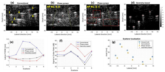 The reconstructed numerical images using (a) conventional beamforming, (b,c) phase-screen modeling, and (d) geometry-based reconstruction techniques with a realistic bone model (Figure 3b, based on the micro CT of a real human temporal bone). The aberration profile was estimated using a dataset generated with a (b) homogeneous and (c) heterogeneous background wave-speed model. The red dots indicate the true location of the scatterers. The lateral FWHM (e), the signal-to-clutter ratio (f), and the localization error (g) obtained with all the methods for each scatterer.