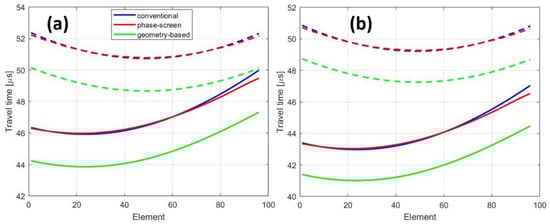 The travel-time estimated for scatterer 1 (solid lines) and scatterer 3 (dashed lines) positioned in patch 1 and 3, respectively (see Figure 3c), with the three different reconstruction techniques when a steered plane wave at (a) −15 degree and (b) 0 degree is used for transmission. The bone and background models were flat and homogeneous, respectively.
