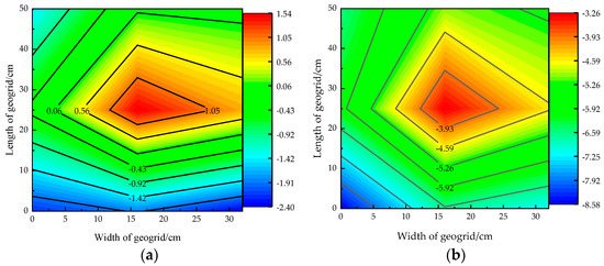- In the nonfreezing state (0 °C), there is a strong correlation between the shear strength and water content. When the water content is 4.5%, the peak shear stress under each normal stress is the largest. However, the larger water content will reduce the interface shear strength of the reinforced soil composite. The shear strength of the interface between the frozen state (−5 °C) and the nonfrozen state (0 °C) is different. When the water content is 4.5% and 7%, the peak shear stresses under different normal stresses are very close. The main sources of the difference are the cementation of pore ice in the soil skeleton under the freezing state (−5 °C), the improvement in the strength of the soil particles and the further interlocking effect of the geogrid on the soil.