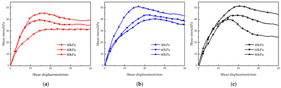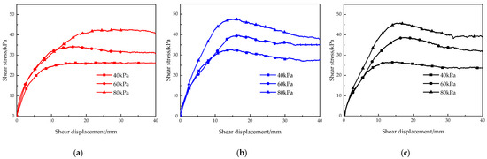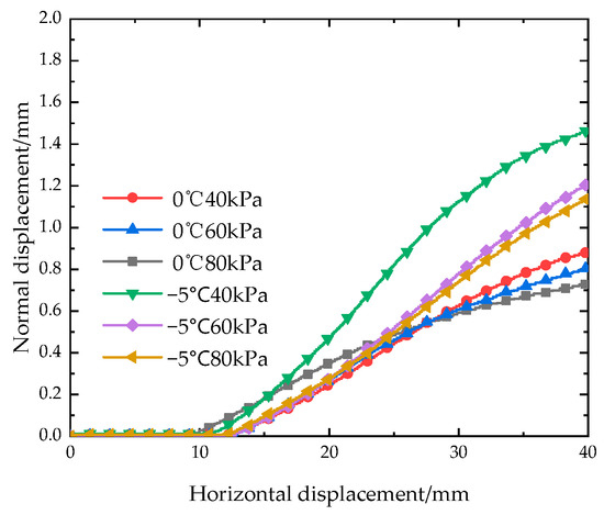 - The trends of the shear displacement-shear stress curve of the geogrid–coarse-grained soil interface under the nonfreezing state (0 °C) and freezing state (−5 °C) are basically the same. Under the condition of low normal stress, the curve has no obvious peak value, which is closer to the ideal elastic-plastic double linear model. In the state of high normal stress, the curves have more obvious peaks, and the curve type is closer to the elastic-strain softening type.