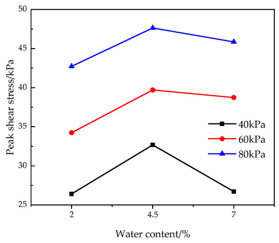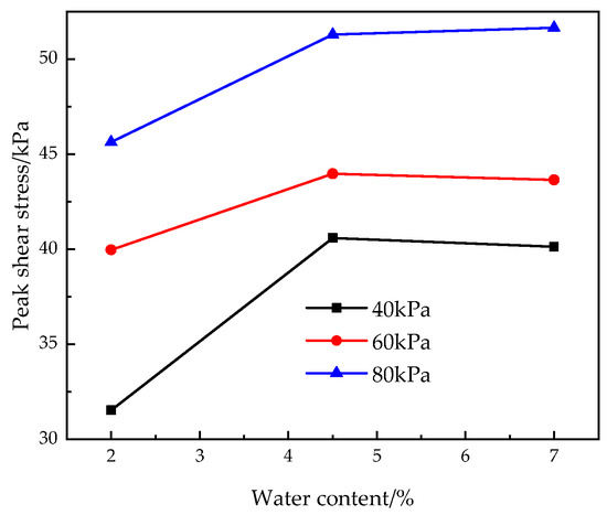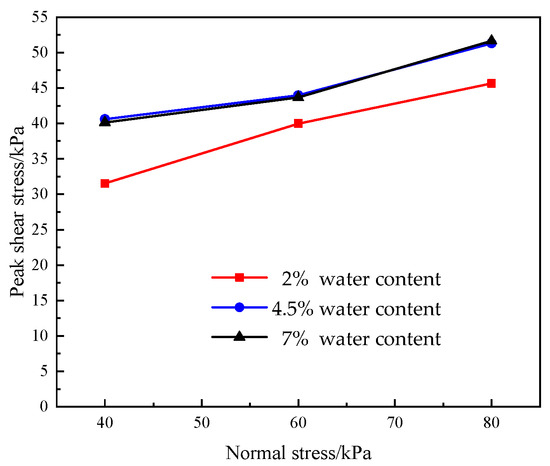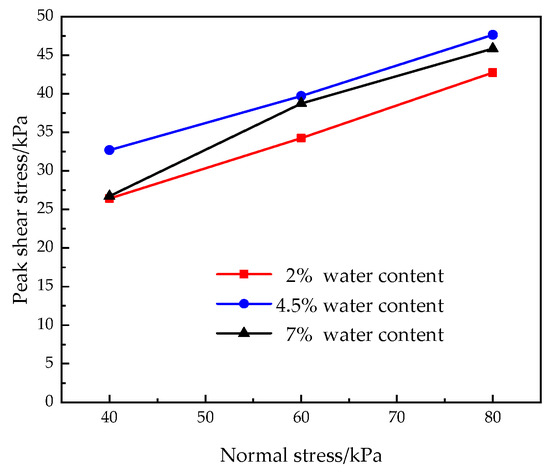 - Compared with coarse-grained soil reinforced by geogrids in the nonfreezing state (0 °C), the shear strength of the frozen state (−5 °C) is significantly improved. Under normal stresses of 40 kPa, 60 kPa and 80 kPa, when the water content is 2%, the corresponding peak shear stress increases by 19.39%, 21.71% and 11.34%, respectively. When the water content is 4.5%, the corresponding peak shear stress decreases by 29.98%, 16.17%, and 13.83%. When the water content is 7%, the corresponding peak shear stress decreases by 50.85%, 18.64%, and 21.96%.