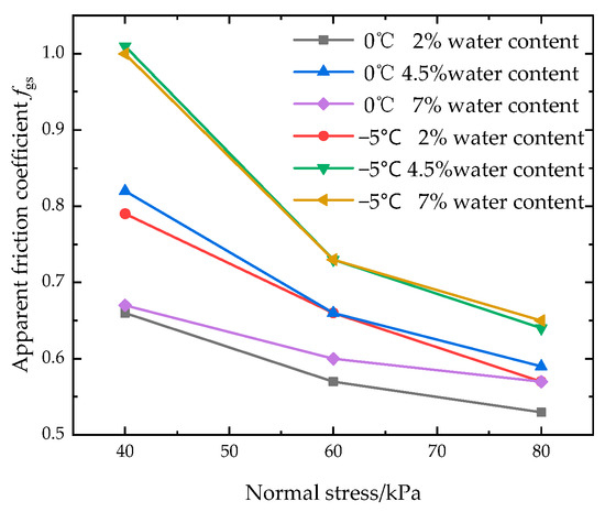 - The apparent friction coefficient between the geogrid and coarse-grained soil interface in the nonfreezing state (0 °C) and freezing state (−5 °C) decreases with increasing normal stress, and the downward trend is steep to slow. This is mainly because the soil particles are more likely to move under the action of the transverse ribs of the geogrid under the condition of low normal stress. With the decrease in temperature, the dilatancy phenomenon of the reinforced soil composite is more obvious.