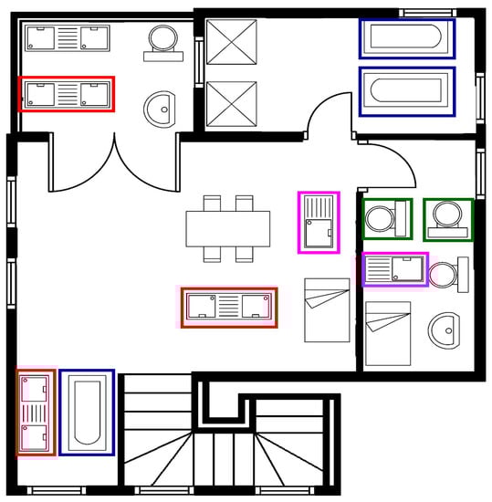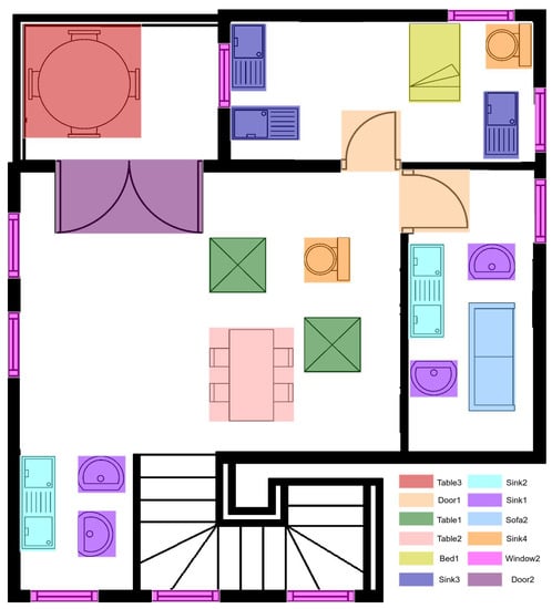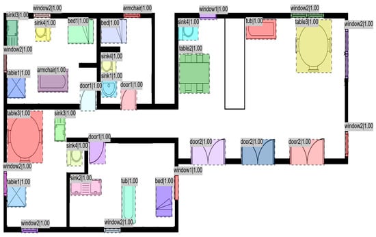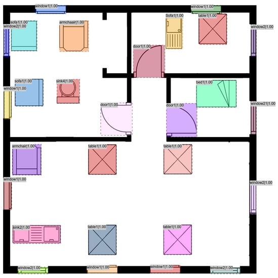 Figure 5 shows that tub and sink furniture class items have different directions based on the provided angle. Another augmentation method is scaling with a random scaling factor between [20, 40, 75, 100, 145, 185, 200]. During scaling, we keep the same aspect ratio for all furniture classes. Figure 5 shows the sample image of this floor-plan dataset in which all furniture items are nearly the same size. The red and blue rectangular box objects demonstrate that sink and tub classes can vary in orientation. Further, we notice that some furniture items are present in particular rooms, which helps recognize room categories for different furniture items. This SFPI dataset is publicly available and can be downloaded from here https://cloud.dfki.de/owncloud/index.php/s/mkg5HBBntRbNo8X, accessed on 29 August 2022.