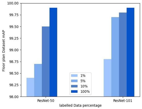 Using a semi-supervised approach, we detected objects on the pixel level, such as different furniture items in the floor-plan data. We used Mask R-CNN [] with Feature Pyramid Network (FPN) [] as a detection method, ResNet-50 [] and ResNet-101 network as a backbone pre-trained on the ImageNet dataset [] with the student–teacher approach. We used 1%, 5%, and 10% floor-plan images as labeled data for training and the rest of the images as label data. We used five data folds for each percentage level and calculated the final performance by taking the average of these five folds. Figure 2 compares the performance of both these backbones under the different percentage of label data settings. The increasing colour of bars indicates the increase in the percentage of label data. We obtain 98.8(%) mAP, 99.7(%) mAP, and 99.8(%) mAP on Mask R-CNN [] with ResNet-101 [] backbone network for 1%, 5%, and 10% floor-plan images, respectively. This paper provides an end-to-end semi-supervised approach-based object detection in the floor-plan domain. The main contribution of this work is as follows: