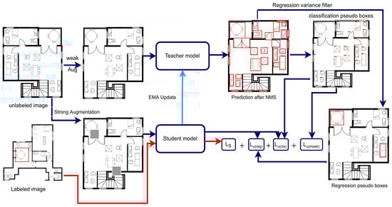 The semi-supervised approach-based object detection needs a small amount of labeled data with label data. There are some multi-stage approaches [,] that use label data for training in the first stage, followed by unlabeled data for generating pseudo labels, and then retraining on unannotated data. The model performance depends on the accuracy of the generated pseudo label, but the available training data is small, which reduces model efficiency. To increase label data, we generate pseudo labels using a semi-supervised approach and then use these pseudo labels and small portions such as 1% of the label data to train the model. We randomly sample label and labeled data, in which both portions include all classes present in available data. We used two models for our experiment on the floor-plan dataset, the first is for detector training, and the second is for generating pseudo labels for unlabeled data. This approach provides simplified multi-stage training. Further, it uses the flywheel effect [], in which the pseudo label generator and training detector can boost each other to improve model performance with increasing training iterations. Another important benefit of this approach is that more weight is provided to the pseudo-label generator model rather than the training detector model, as it guides the training model instead of providing hard category labels, as in earlier techniques [,]. This approach is also proposed in the Soft-Teacher model []. In this network, the teacher model uses a pseudo-label generator, and the student model uses the training detector.