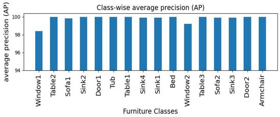 Figure 6 shows the average precision of every class separately. It is evident that some classes, such as armchairs, door2, table3, bed, table1, tub, door1, sink2 and table2 demonstrate one average precision, while all other classes show average precision above 0.95 except window1 class. We can observe for which classes our model performs well and where we need further improvements. Figure 7 shows the furniture items detection and localization on the floor-plan test dataset. The final result, where furniture items are detected and labeled in different colours, accurately detects all 16 classes.