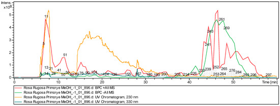 This procedure allowed a detailed evaluation of the rose MeOH extract fraction and the tentative identification of up to 146 phytochemicals (Table A1 (Appendix A)). The most represented classes of polyphenolic compounds were flavonoids (flavonols, flavones, flavan-3-ols, flavanones) with a total of 68 polyphenols identified for the first time. Some polyphenols were identified for the first time in the genus Rosa (family Rosaceae).