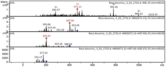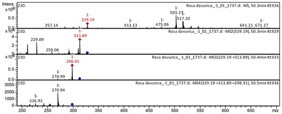 The flavones 5,7-Dimethoxyluteolin (compound 5), Cirsimaritin (compound 6), Chrysoeriol methyl ether (compound 7), Cirsiliol (compound 8), Tricin (compound 9), Jaceosidin (compound 10), and Syringetin (compound 13) (Table A1 (Appendix A)) have been already characterized as components of Syzygium aromaticum [18], Ocimum [19], Rosmarinus officinalis [20], Bougainvillea [21], Triticum aestivum [22]; millet grains [23]; Sasa veitchii; Phyllostachys nigra [24], etc. Thus, the flavone Jaceosidin was found in extracts of R. davurica. The flavone 5,7-Dimethoxyluteolin was found in extracts of R. rugosa and R. davurica. The CID-spectrum (collision induced dissociation spectrum) in negative ion modes of Tricin from extracts of R. davurica is shown in Figure 4.