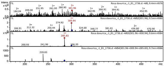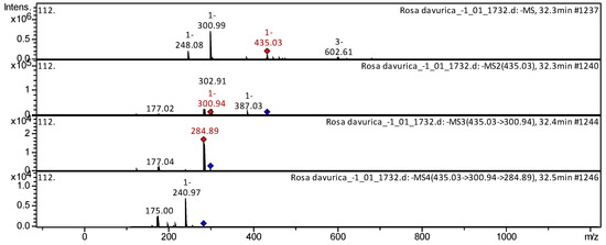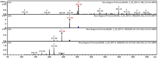 The flavonols Quercetin (compound 23), Morin (compound 24), Rhamnetin I (compound 25), Rhamnetin II (compound 26), Isorhamnetin (compound 27), Avicularin (compound 31), Taxifolin-O-pentoside (compound 32), Taxifolin-3-O-hexoside (compound 33), and Isorhamnetin triacetyl hexoside (compound 37) have been already characterized as components of Bougainvillea [21], Rosa rugosa [30], Propolis [31], Rhus coriaria [32], and Potato leaves [35]. Thus, the flavonol Taxifolin-O-pentoside was found in extracts of R. davurica. The CID-spectrum in negative ion modes of Taxifolin-O-pentoside from extracts of R. davurica is shown in Figure 8.