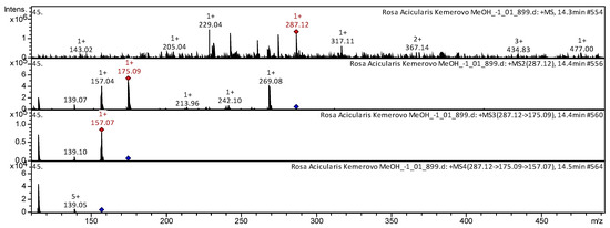 The flavonols Kaempferol (compound 20), Dihydrokaempferol (compound 21), Kaempferol-3-O-α-l-rhamnoside (compound 30), Kaempferol diacetyl hexoside (compound 34), Kaempferol 3-O-rutinoside (compound 35), and Kaempferol 3-O-deoxyhexosylhexoside (compound 36) have been already characterized as components of F. glaucescens [25], Andean blueberry [28], Rhus coriaria (Sumac) [32], Lonicera japonica [34], Potato leaves [35], Rapeseed petals [36], Echinops lanceolatus [37], Camellia kucha [38]. Thus, the flavonol Kaempferol was found in extracts of R. rugosa, R. davurica, and R. acicularis. The CID-spectrum in positive ion modes of luteolin from extracts of D. palmatum is shown in Figure 7.