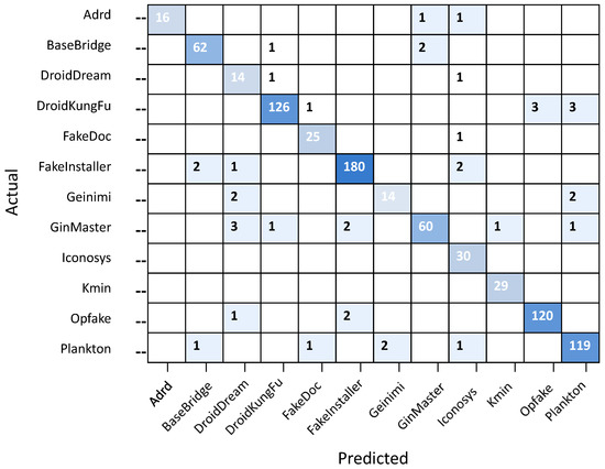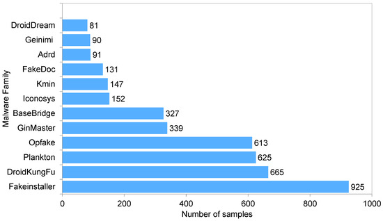 The dataset employed in the experimental validation of the proposed model consists of 5546 malicious and 5831 benign Android APK files. The benign files were obtained from the AndroZoo database, where the (.CSV) file annotates the description of each app file in the dataset. The malware files collected from the Derbin database consisted of 179 malware families collectively. The malware family files such as Fake-Installer, Droid-KungFu, Plankton, Op-fake, Base-Bridge, Gin-Master, Iconosys, Kmin, Adrd, Geinimi, Fake-Doc, and DroidDream are considered in the database. The details of the dataset family samples have been shown in Figure 5. The complete database is divided with a ratio of 7:3 for training and test sets, respectively.